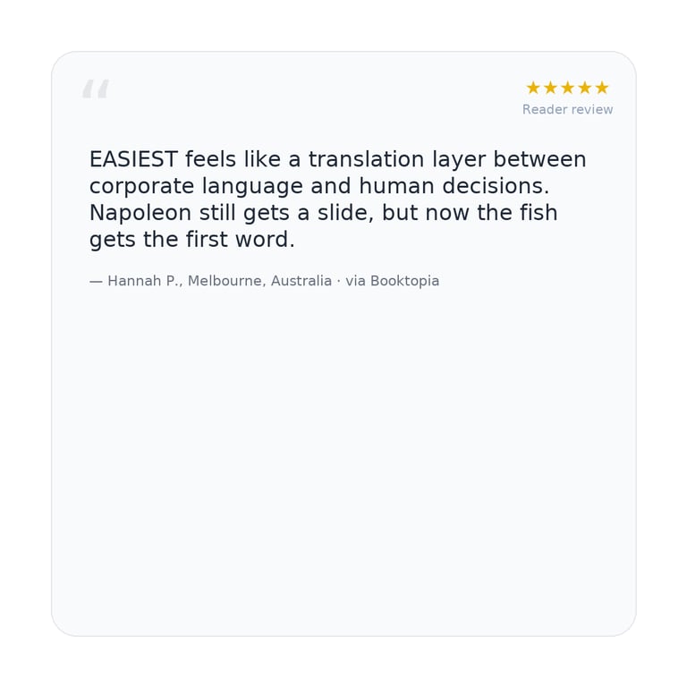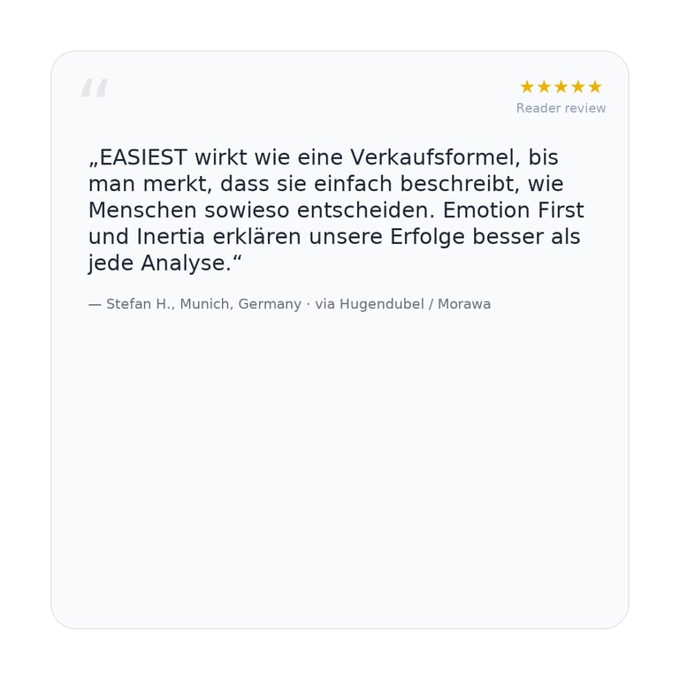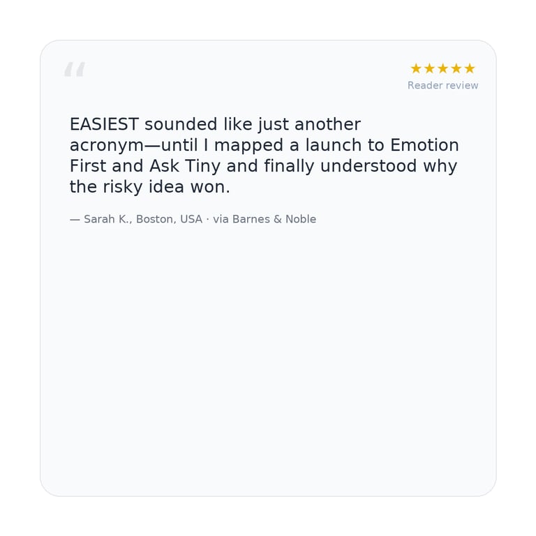 This isn't a book you read and feel inspired. This is a playbook you steal from. At its core is the E.A.S.I.E.S.T framework—the easiest way to trigger human decisions. Seven steps built on how humans actually decide, not how they should. Emotion first. Tiny actions. Social proof that's close enough to matter. Each principle comes with a Monday Morning Test—something you can try immediately, not theories you'll forget by Tuesday. Backed by behavioral science, field-tested in real markets where logic goes to die. Read it for the stories. Use it for the wins.