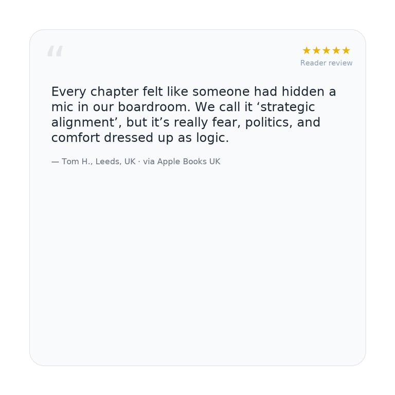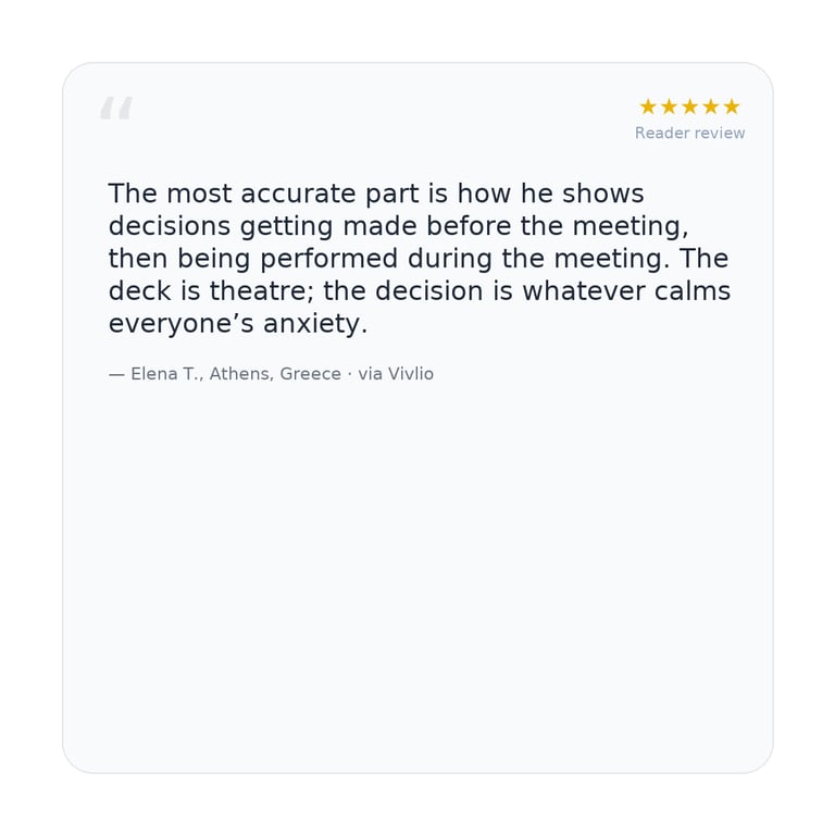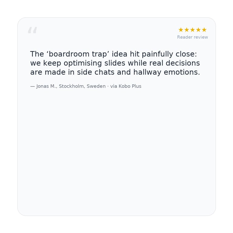 The book has reached readers in 70+ countries across every industry imaginable. Why? Because human decision-making is universal. A procurement manager in Munich and a hospital administrator in Dubai have the same psychological software. The details change. The fish doesn't.