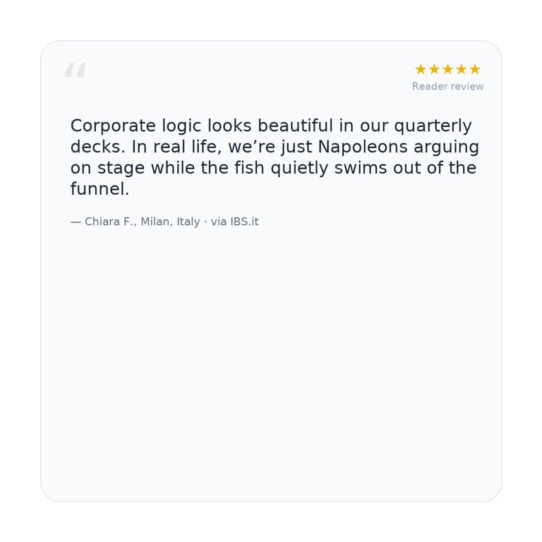 This whole book is your invitation to accept one uncomfortable truth: humans don't buy spreadsheets. And by "spreadsheets" I mean logic, evidence, numbers, data—all the rational firepower you thought would finally make them say yes. Most of the time, it doesn't. Not your calculation. Not your competitive matrix. Not that slide deck you redesigned seventeen times. Because what actually decides is the fish, not the general.